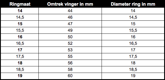 Kies bij twijfel de grootste maat. Zit je na het ringmaat opmeten precies tussen twee ringmaten te twijfelen? Kies dan altijd voor de grootste ringmaat. Een ring in een ringmaat die te strak zit of zelfs niet eens past is nooit fijn!