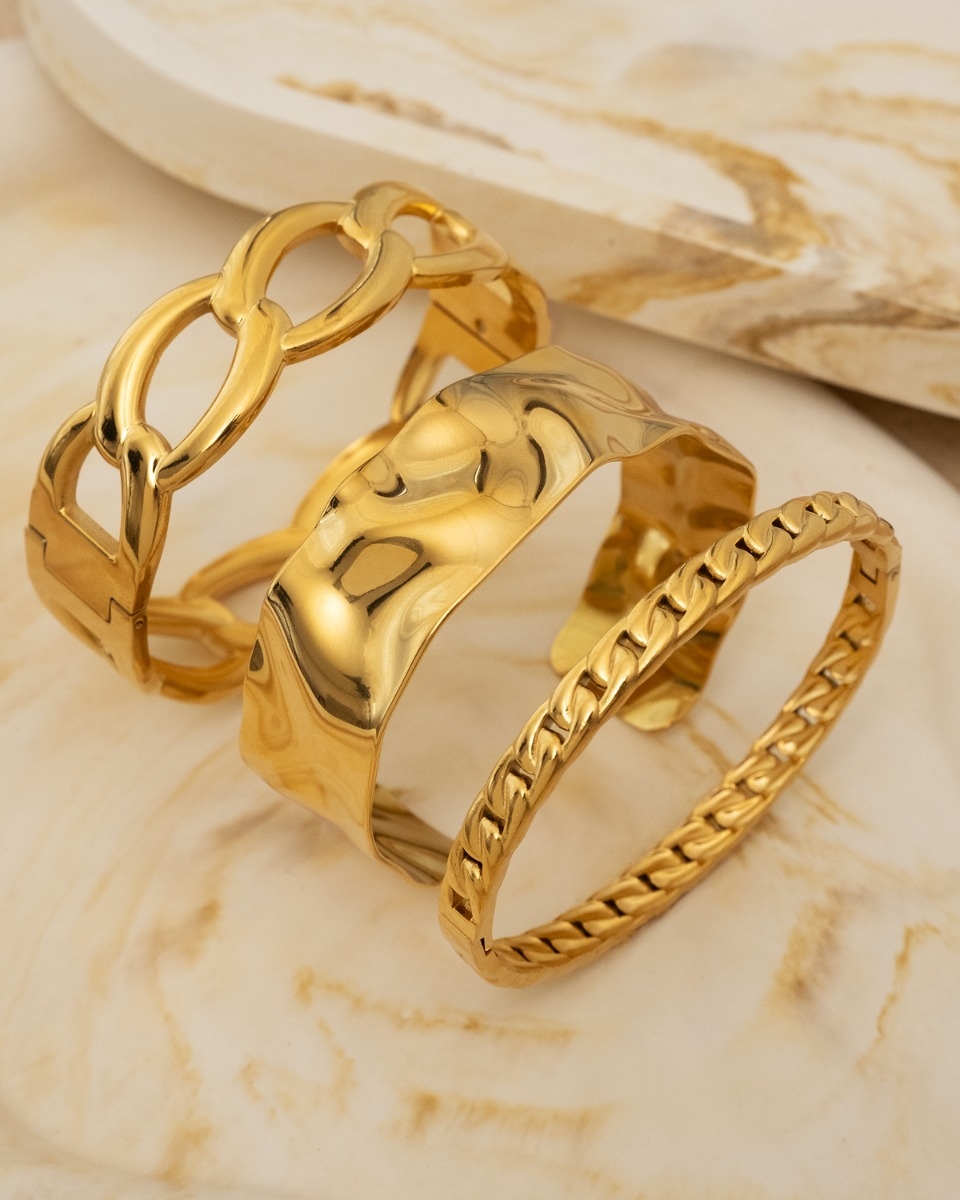 Bangles zijn stevige armbanden met een vaste vorm die je om je pols schuift. Sommige modellen hebben een kleine opening, waardoor je ze gemakkelijk om kunt doen, terwijl andere volledig gesloten zijn. In tegenstelling tot flexibele armbanden met schakels of sluitingen behouden bangles altijd hun elegante, ronde vorm. Ze worden vaak gemaakt van metaal in goud- of zilverkleurige afwerkingen, maar zijn er ook met prachtige details zoals steentjes, parels of subtiele gravures. Die vaste vorm zorgt voor een chique en moderne uitstraling, het soort accessoire dat direct de aandacht trekt, zonder dat je er veel voor hoeft te doen.